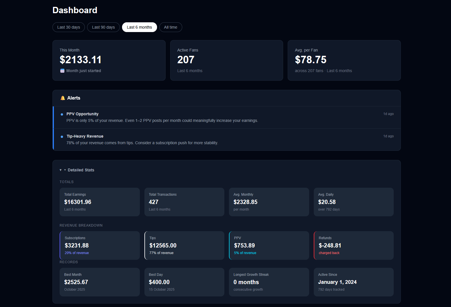 FanStats.io takes your OnlyFans export CSV and turns it into a dashboard that finally makes sense of your performance: